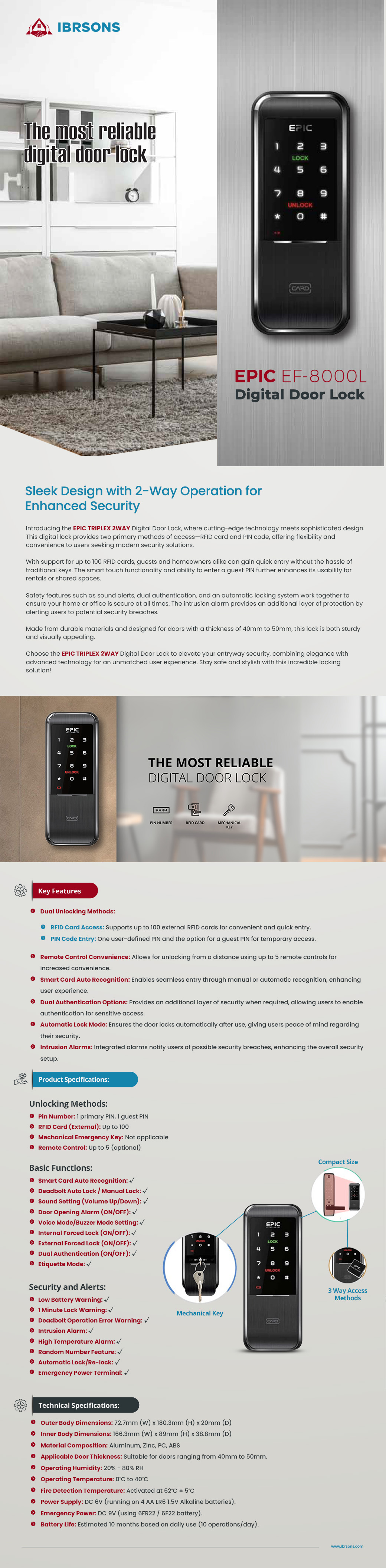 EPIC - TRIPLEX 2WAY Elegant Design 2 Way Operated RFID Card & Pin Method Digital Door Lock - Remote Controlled